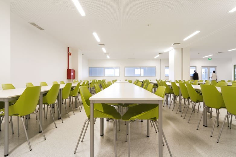 Proche de la cafétéria se trouve une zone de restaurant et de cantine. Dans laquelle, les tables Dynamic sont disposées de façon linéaire continue, à surface blanche et à piétement de couleur aluminium. La chaise Viva, de couleur verte pistache, met une note de couleur. Le dossier comme l'assise sont fabriqués en double injection de matériaux SEBS sur une carcasse rigide en PP de particules minéraux, pour offrir une superficie matelassée, doux au toucher et résistant pour les zones à usage intensif.