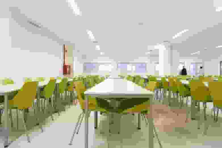 La cafétéria est aménagée du programme de Tables de Cafétéria, avec la nouvelle version en hauteur, de 110 centimètres, qui servent de point d'appuie pour une restauration debout et informelle.