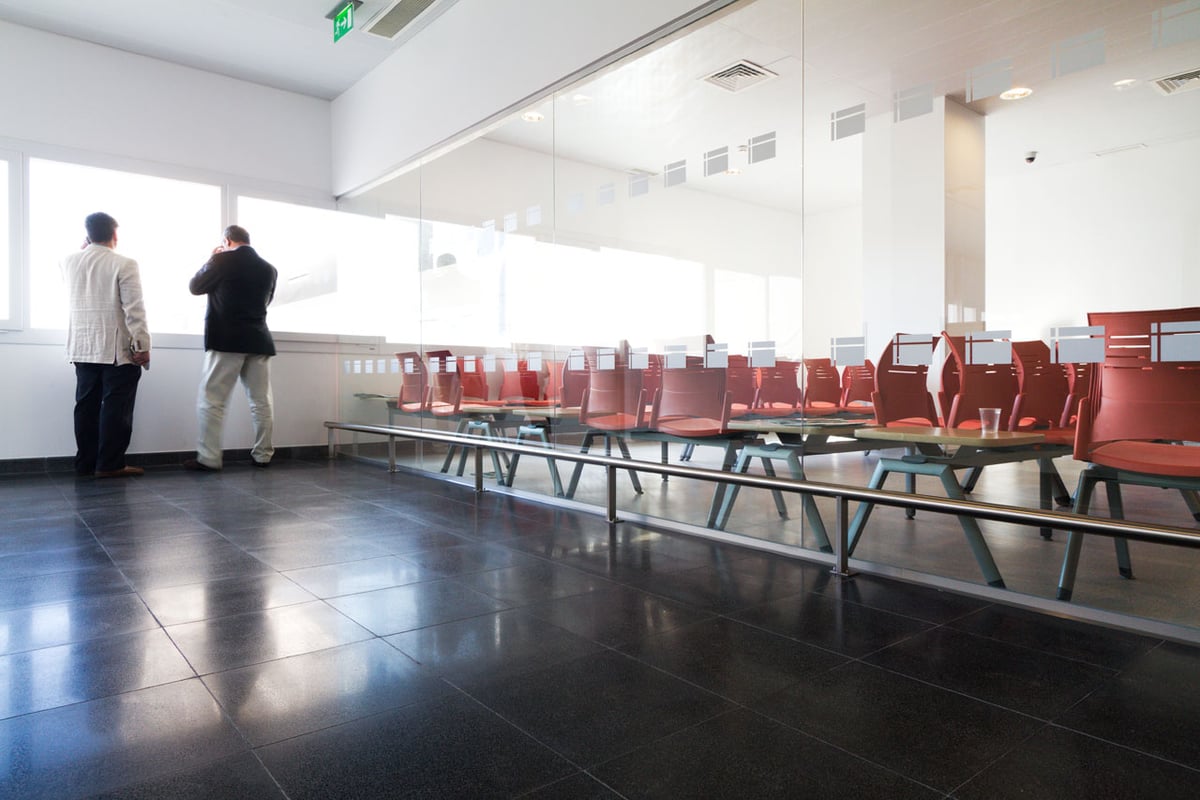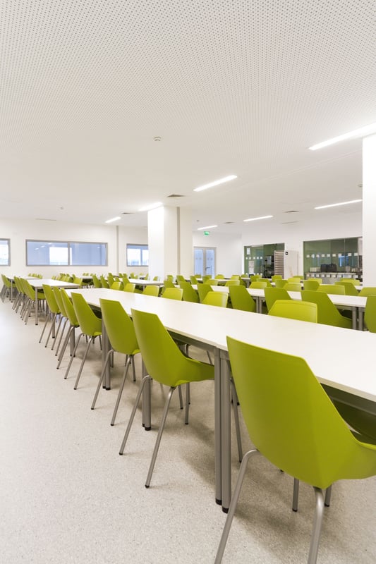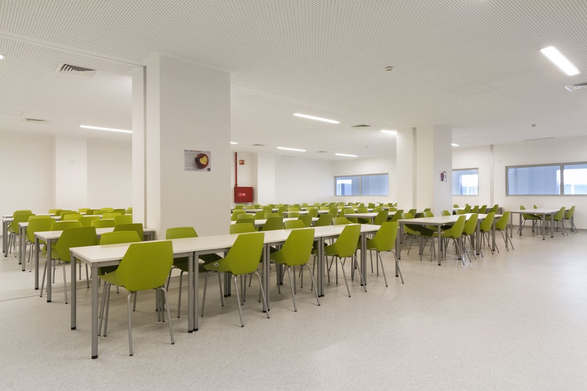 Proche de la cafétéria se trouve une zone de restaurant et de cantine. Dans laquelle, les tables Dynamic sont disposées de façon linéaire continue, à surface blanche et à piétement de couleur aluminium. La chaise Viva, de couleur verte pistache, met une note de couleur. Le dossier comme l'assise sont fabriqués en double injection de matériaux SEBS sur une carcasse rigide en PP de particules minéraux, pour offrir une superficie matelassée, doux au toucher et résistant pour les zones à usage intensif.